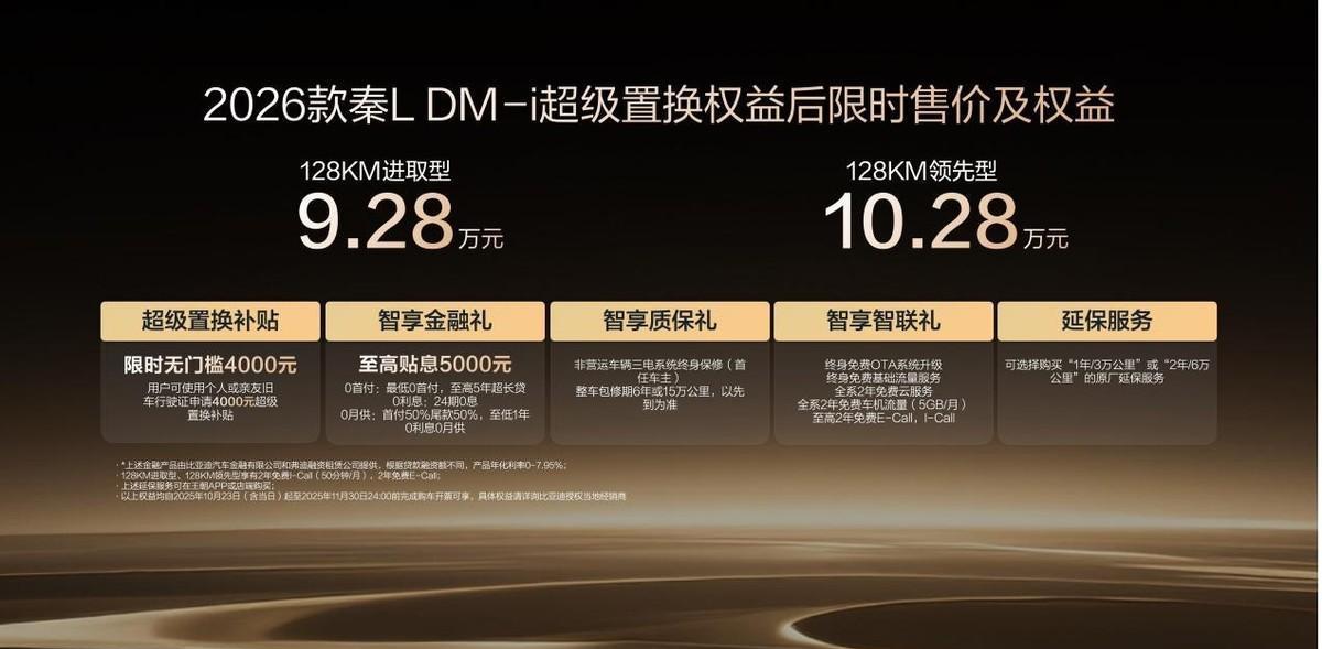 聊完宋,来看秦,2026款秦L DM-i 128KM进取型和128KM领先型来了,9.28万就能拥有,拥有128km纯电续航,2.79L超低油耗,主打一个足足够省。